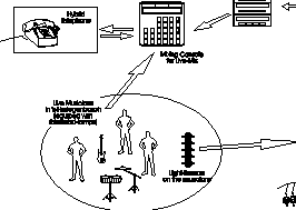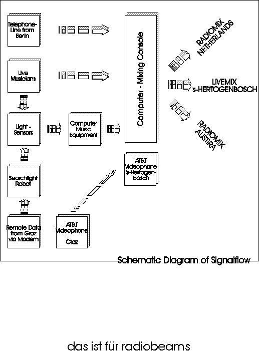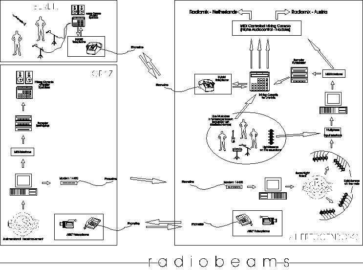 D.h. Musiker/Performancekünstler an verschiedenen Orten, (Graz, Hertogenbosch, Berlin) sind über Telefon-, Daten- und Rundfunkleitungen miteinander verbunden, um auf dieser so entstehenden "telematischen Bühne" miteinander zu spielen. Die dabei zum Einsatz kommende Technologie, die stellvertretende Anwesenheit der Person durch ihre aus der Ferne übertragene Aktion sowie die Möglichkeit der augenblicklichen Einflußnahme auf die Geschehnisse an den jeweils anderen Orten bilden die zentralen Gestaltungsmittel des Projektes.