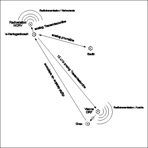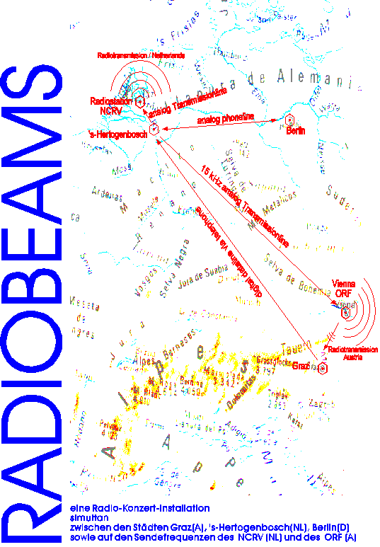 Dem Wesen von Telekommunikationsmedien entsprechend, werden sich die Musiker in Graz und Berlin in "hausmusik-ähnlichen" Situationen mit kleinem Publikum, ev. nur Freundeskreis, direkt von ihren Arbeits-, bzw. Wohnplätzen aus in diese Live-Produktion einschalten. Von privaten Raum des Künstlers aus gelangt so die Aktion, verschiedene öffentliche Räume tangierend (Konzertsaal 's-Hertogenbosch, Radioprogramm) in den privaten Raum des Radiohörers. Die lineare Kontinuität der Raum-Zeitperspektive tritt zurück zugunsten einer Simultaneität der Prozesse.