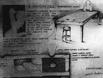 (Remembering Sound) Starke Endstufen, die den Ton komprimieren und verstärken, sind im Tisch eingebettet. Man kann den auf Tonband aufgezeichneten Ton nur hören, wenn man die Ellenbogen in die Vertiefungen auf der Oberfläche des Tisches aufsetzt und die Ohren mit den Händen bedeckt. Der Klang wird durch die Endstufen vom Band über die Schraube über den Schädel geleitet. Die Vertiefungen des Schädels werden somit zu Lautsprechern. "Ich gestaltete diesen Tisch um Vibration, Depression, Meditation, das Gefühl einer möglichen Elektrisierung und den Klang an den man sich scheinbar eher erinnert als daß man ihn hört, zu kombinieren. Was ich Orthophonik Sound nenne, wurde in vielen meiner Performances bereits verwendet - ich habe den Raum tonen lassen, sodaß man Klang sowohl gefühlt als auch gehört hat. Diese Arbeit ist eine eher intime Version dieser Art von raumbezogener Musik..." |