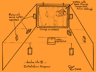 The piece refers to the virtual, ideas of public versus private, and the connection to the physical places from which the electronic content is derived. Inside the installation, the viewer moves within a rendition of the artist's house. This house is idealized and extended into the electronic domain.