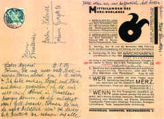 #22 Hartmut Geerken - improvisation on a postcard from kurt schwitters to salomo friedlaender improvisation on a postcard from kurt schwitters to salomo friedlaender / myona kaum war das geschwitter unmittelbar über mir musste ich elfmal niesen ich lebe gemäss meiner individuellen zustände am dienstag hasse ich diese ganze scheisse am donnerstag habe ich diese ganze scheisse vergessen der staub in dem ich lebe ist weniger versöhnlich als früher wenn ich ausspeie kommts schwarz und schlunzig zwischen schreyer & schwitters bekomme ich einen nicht enden wollenden hustenreiz bei serner gar überkam mich die ausleerung beim gedanken an den verleger hat vielleicht vormärz was mit schwitters zu tun (aus: hartmut geerken, kant, 1998)
