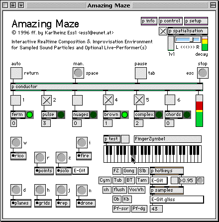 Diese Realtime Komposition, die von Karlheinz Essl als work-in-progress konzipiert wurde, beruht auf einer Vision des Komponisten, die ihn schon seit vielen Jahren begleitet, wie er selbst sagt. Bei dieser "Vision" handelt es sich um ..."Musik, die sich im Augenblick ihres Erklingens wie von selbst (autopoietisch) komponiert und nicht bloß Realisation eines ausformulierten Notentextes ist. Eine adaptive Musik, die auf äußere Einflüsse zu reagieren vermag und in ihrer zeitlichen Ausdehnung potentiell unendlich ist, ohne sich je zu wiederholen." Für Amazing Maze bedient sich Essl seiner von ihm selbst erstellten Real Time Composition Library (RTC-lib). Mit Hilfe eines von ihm entwickelten Computerprogramms generiert sich Amazing Maze aus reichhaltigem Klangmaterial, das aus Instrumentalaufnahmen gewonnen wurde, wobei sieben MusikerInnen auf diesen Prozess zugleich interaktiv Einfluß nehmen.