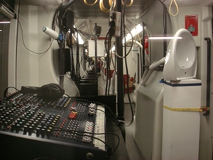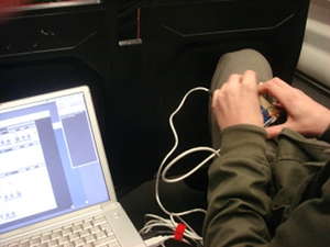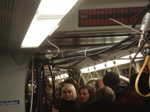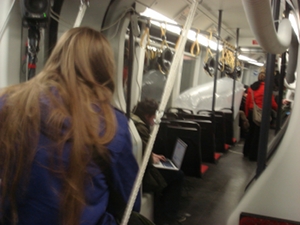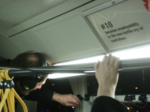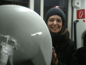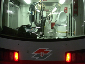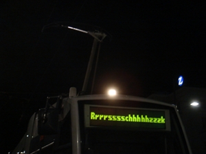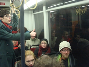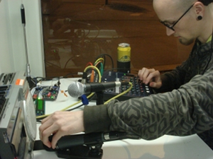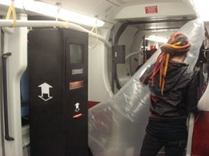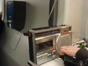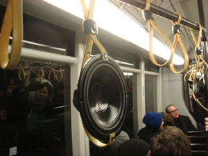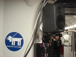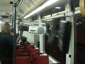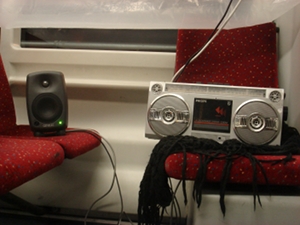 ![]() „The tram becomes an exhibition space. Its movement relates to twelve time based works installed inside. The stations on the route allow people to get on the tram, and they structure the ride in temporal sequences. The performative exhibition is displayed through sic acoustiv perspectives, broadcast live on the radio. By moving the six microphones through the exhibition space, the sounds within the tram become the material for a time based deconstruction of space in a multi-channel radio installation. A multi-perspective listening situation unfolds in the private listening space, as the radio audience ist requested to set up three radio receivers and tune them in to three radio stations.” The plan was to leave the train depot at 23pm sharp. However, due to a capacity overload of the they electricity supply through the installations the train started some 20 minutes late. At the first stop, Alser Straße, people got on the train which transformed the tram into a crowded art space. In the meantime, the radio broadcast of „informal radio“ had started: six people with pin-up microphones walked through the train carriage, slowly and one after another. Starting at the rear, they walked up to the front where they got off and ran back to the end of the train. The first two micophones fed the channels of Ö1, the middle ones those of FM4, and the last ones provided the sounds for the free radio programmes such as orange94.0. The ORF technicians aboard were Martin Leitner, Susanne Wirtitsch and Hannes Stern, who explained the technical background of the live radio show: “We broadcast the single channels via three stereo transmitters to the Kahlenberg, where the ORF has three stereo receivers. Via El-net, a digital line, the data are transported to the Funkhaus in Vienna and then disseminated on the three radio stations. For each we have one antenna attached to the outside of the tram, cable-connected with the up to 16 Watt transmitters. For the stereo transmission you have to add and subtract the two channels in order to generate a Multiplex frequency. This modulation is sent to the receivers and via subtraction and addition this mix of frequencies can be transformed back into two channels. It is quite recent that the equipment was developed.“ ![]() Kathrin Stumreich // DER FADEN // http://www.kathrinstumreich.com Viktoria Wöß // schaukel joaknierzinger // toilettophone // http://joak.nospace.at/ Mara Bloom // monolog einer straßenbahnreisenden HPL // elektrostimmen Johannes Muik // mängel gegenstände hängen // http://www.muiki.mur.at Daniel Gyolcs // Radio#maT mths // radio feedback // http://mtks.tumblr.com Miriam Moné // schienenlieder Conny Zenk // ▀▀ ▀▓▓▀╘════ Conny Zenk + mths // aufblasbar // http://gaffabandl.wordpress.com Karl Salzmann // Transport³ // http://www.karlsalzmann.com Jan Perschy // hot bin // http://janperschy.com |