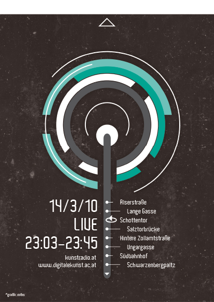 The tram functioned as a mobile exhibition space for twelve time-based installations by Kathrin Stumreich, Viktoria Wöß, JoaKnierzinger, Mara Bloom, hpl, Johannes Muik, Daniel Gyolcs, mths, Miriam Mone, conny zenk, Karl Salzmann, Jan Perschy, Conny Zenk + mths. Those who hadn’t boarded the train at the tram depot Hernals, the starting point, were able to hop on at six tram stops on the route, which marked the episodes of the ride. Or to listen on the radio. Six microphones were moved through the carriage and provide the sounds for the 6-channel-radio broadcast. Listeners were asked to set up three radios, ideally stereo, and tune each in to another station: