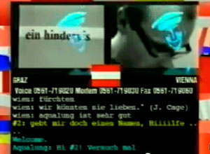 PIAZZETTA VIENNA ist mit Graz vernetzt: von dort aus wird ZEROnet, eine neue Kunst Mail-Box, ihre interaktive On-line Oper "The Big Net Jam" zuschalten. Außerdem ist PIAZZETTA VIENNA natürlich auch mit PIAZZA VIRTUALE, d.h. mit dem gesamten 3-SAT-Sendebereich verbunden.Über Telefonleitungen werden die Live-Sendungen der Piazzetta Vienna zur Dokumenta nach Kassel in das computergesteuerte Studio des Van Gough TV's übertragen und von dort über 3SAT ausgestrahlt. Was die Piazzetta Vienna von den übrigen Piazzettas in aller Welt unterscheidet, ist die Ansteuerung von Klangerzeugern mittels Midi-Daten. "Midi ist ein Übertragungssystem, eine Sprache auf die sich führende Musikinstrumentehesteller ursprünglich geeinigt hatten, um verschiedene Synthiseizer so miteinander zu verbinden, sodaß es möglich sein sollte auf einem Gerät zu spielen und gleichzeitig die Klänge eines zweiten Grätes anzusteuern. Der damals vereinbarte Standard hat sich als sehr sinnvoll erwiesen, sodaß heutzutage sehr umfangreiche Steuerungsmöglichkeiten zur Verfügung stehen und eigentlich durch Midi eine regelrechte Revolution im Musikbereich ausgelöst wurde." Auch im Rahmen der Aktivitäten bei Van Gough TV war anläßlich der Dokumenta IX eine Midi Übertragung, also eine Übertragung von Daten nach Kassel vorgesehen und hat auch statt gefunden. In Kassel wurden entsprechende Klangerzeuger aufgestellt und von Wien und Graz aus angesteuert. Über Telefon wurden nur die Daten übermittelt und erst im Studio in Kassel wurde daraus wieder konkreter Klang. Dies hatte zur Folge, daß die Begrenzung der Telefonleitung - 4 Kiloherz etwa- umgangen wurde und so eine hervorragende Qualität des Klanges erreicht werden konnte. Live und in Echtzeit wurden während der Sendungen von Wien und Graz alle dortigen und die in Kassel angeschlossenen Klangerzeuger angesteuert. Die Umwandlung der Midi-Daten in konkreten, hörbaren Klang durch die Klangerzeuger fand gleichzeitig an 3 Orten statt. Bei den in Kassel zu hörenden Klängen handelte es sich im wesentlichen um eigenes Material also um selbst entworfene Klänge. Das Ansteuerern dieser Klänge war allerdings nicht die einzige Aktivität, sondern es ging auch darum, die Stimmen der Anrufer über entsprechende Geräte -vor allem Pitchtransposer -, die auch in Echtzeit über Midi Befehle erhielten, zu manipulieren. "Der ursprüngliche Anstatz von Van Gough, vor allem Kommunikation zu ermöglichen, ist einerseits durch die Midi-Kommunikation erweitert worden. Im konkreten Ergebnis für die Anrufer hat es aber eigentlich eine Störung der Kommunikation zur Folge." |