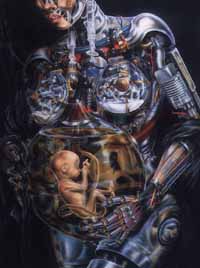 Die visionäre und fortschreitend realisierbar erscheinende Vorstellung von der Verquickung von Mensch und Maschine in näherer Zukunft gipfelt in der Vertechnisierung der menschlichen Physis, oder - in der technischen Substitution alles Körperlich-Organischen: der "perfekte", "reine", unverwesbare virtuelle Roboter-Körper entsteht, ein technologischer Körper, der als "schwangerer Roboter" die biologische durch die technische Reproduktion zu ersetzen vermag.