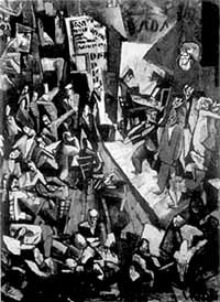 On February 1st 1916 Hugo Ball founded the Cabaret Voltaire at Spiegelgasse 1 in Zurich. (Lenin was living at Spiegelgasse 12 at the time). The owner of the bar at Spiegelgasse 1 hoped that the literary cabaret would further the sales of beer and sandwiches. And his hopes were fulfilled. Already on February 5th Ball reported that the premises were more than full, many people could not find a place. Among those who arrived early in the evening were four men with folders and paintings under their arms: Marcel Janco, the painter, Tristan Tzara, Georges Janco and a fourth man whose name Ball forgot. Arp was there also and an atmsophere of unanimity prevailed. Janco put his painting on the wall and Tzara read from poems he produced from his pockets. |