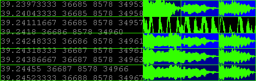 <Data Score> is an audio art work, based on data from radio astronomy scans received during the Acoustic Space Lab workshop in August 2001. The data raws contains coordinates of planet radiation. Each number represents the specific sound sample. Number combinations together represent a method of sound manipulation. Thus data sequences create rhythmical sound structures. #Date: 8 / 08 / 2001 |