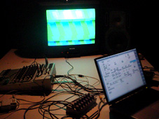 • Tonight, Derek Holzer and Bas van Koolwijk will interact and play with the present acoustic situation in the Medienturm, composing a live radioversion for the Kunstradio broadcast. In their live performance they will create a stereo radioversion of the four-channel installation: A loop of signals and sounds circulate - beginning with digital video signals triggered by Bas van Koolwijk entering the analogue monitor where due to a special software they are transferred into sound; Derek Holzer processes these with his computer and sends them as analogue sound signals back to the the point of beginning, the digital video.