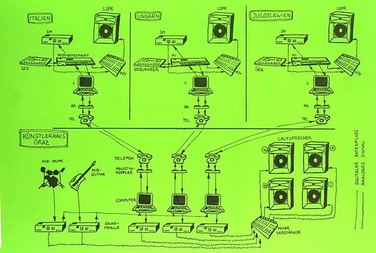 Eines der weltweit ersten Online-MIDI-Konzerte fand 1987 simultan in Graz, Budapest, Trient und Ljubljbana statt: "Razionalnik" von den Grazer Künstlern Seppo Gründler und Josef Klammer.