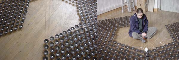In ihrem Atelier hat die bildende Künstlerin Christine Oppel 484 Lautsprecher installiert; diese sind mit ihrer Membran nach oben gerichtet und definieren, dicht an dicht plaziert, eine zweite, schwebende Ebene knapp über dem Boden.