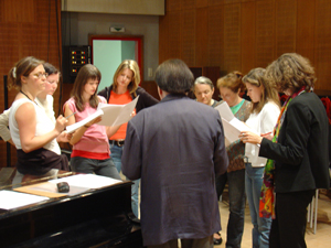 Zuerst sind die Sätze, die ich rausgenommen habe, sind genau gebündelt zu zwölf Sätzen, dem entsprechend dann wieder die Celesta-Klänge. Dann sechs Sätzen, vier Sätzen und Einzelsätzen. Das heißt, dass die Celesta-Zwischenspiele immer knapper aneinander kommen. Und dann, wenn dieser Zyklus abgeschlossen ist, das dauert 12 Minuten ungefähr, werden sämtliche Vokale gleichzeitig gesprochen von den Sprecherinnen und die entsprechenden Akkorde von der Celesta dazu gespielt. Das ist im Großen und Ganzen das Konzept dieser Sache.“