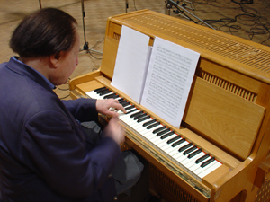 „Wir haben das jetzt so arrangiert, dass eigentlich zwei Hauptschallquellen sind, links und rechts, sodass die Celesta gewissermaßen von der anderen Seite her dem Text antwortet, dass fast so eine Art Echo-Effekt erscheint. Das ist ja eine Sache, die absolut dem Konzept auch entspricht. Denn die Celesta memoriert ja gewissermaßen rein klanglich die Abfolge der Silben. Silben empfindet man ja immer als eine Einheit, beim Sprechen. Man rhythmisiert ja immer Silben, also auf die Vokale hin. Und so entsteht dann dieser Nachklangeffekt, könnte man fast sagen.“