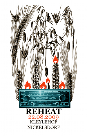 TONBANDDIENST"Zum dritten Mal findet am Samstag, den 22. August 2009 das Reheat-Festival im Kleylehof im burgendländischen Nickelsdorf statt. Nach „Utopie“ und „Gegenpole“ ist dieses Jahr das Thema „Das elektromagnetische Frequenzspektrum“. Für das Ö1 Kunstradio produzieren die Künstler Knut Aufermann und Sarah Washington eine Radiosendung aus Material, das vor Ort entsteht und gespielt wird. Als Werkzeug dient die Software von Dieb13. Reheat-Teilnehmer sind heuer Evamaria Trischak, Hertha Kovacs, Wendelin, Miriam Bajtala & Jan Machacek, Heike Kaltenbrunner, Silvia Fässler & Peter Szely, Dieter Kovačič, Billy Roisz, Robert Mathy, Martin Howse, Alfred Stohl, Wolfgang Musil, tonic train, Thomas Strehl, songs of the magnetic fields, Michael Vorfeld, dr. mayr & derhunt, Tamara Wilhelm & Barbara Kaiser, Chris Janka & David Moises, jade, DJ IZC u.a. Fotos von Anna Soucek:
