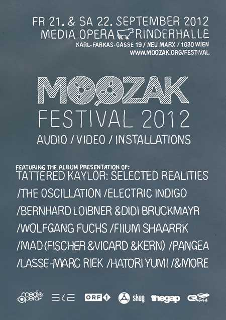 Am 21. und 22. September 2012 hat in Wien zum zweiten Mal das Medienkunst-Festival des Labels Moozak stattgefunden. Das Moozak-Festival „möchte durch das Einbinden verschiedenster Strömungen experimenteller Ton-, Bild- und Objektkunst die Wahrnehmung der Rezipienten erweitern und erneut Grenzgebiete ausloten. (…) Das Verschmelzen unterschiedlicher Disziplinen wird zum einen als Gesamtkunstwerk auf der Bühne präsentiert zum anderen werden die unterschiedlichen Positionen audiovisueller Kunst hinter eindrucksvollen Einzelarbeiten im Ausstellungsbereich erfahrbar gemacht.“