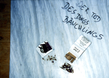 Denzer spricht bei dieser Arbeit den Text selbst, und das in zwei verschieden Betonungsarten. Mit der Stimme nach unten und innen und dann aufzählend, mit der Stimme nach oben und nach außen.