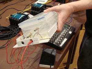 den Bereichen Klanginstallation, Media Art und Social Sculpture aktiv.![]() „Zentrale Steuereinheit einer Radiosendung ist das Mischpult, bestehend aus Knöpfen, Fadern, Drehreglern, Computermaus und Joystick. Unterhalb der sichtbaren Bedienebene befinden sich Drähte, Widerstände, Kondensatoren, Transistoren, Operationsverstärker und Integrierte Schaltkreise. In LIQUID RADIO verfolgen wechselstrom einen radikal neuen Ansatz mit dem von ihnen 2012 entwickelten Tool „Fluid Control“. Alle festen, aktiven Bauteile werden aus dem Mischpult gerissen und durch mehrere bewegliche Tanks ersetzt. Ströme (egal ob Audio-, Steuerströme) werden jetzt allein mit Wasser gemischt, das Radio wird re-analogisiert. Wasser vereint in dieser Anlage alle Funktionen einer Mischpultmatrix in einem einzigen Medium: Schalter, Fader, Panregler und Joystick. Wechselstrom greifen mit vier Händen direkt in das Klanggeschehen ein und erzeugen eine live prozessierte 5.1-Mischung aus Radiosendungen, Synthesizern, E-Gitarren und Effektgeräten.“ Eine Vorschau gibt es auf http://www.wechsel-strom.net/kunstradio.html Link: Video |