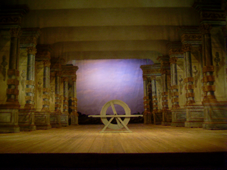 Mit der Regenmaschine des Schlosstheaters Drottningholm, Schweden, erzeugte Arturas Bumšteinas Geräusche für sein Stück "Epiloghi - Sei modi di dire Zangtumbtumb".