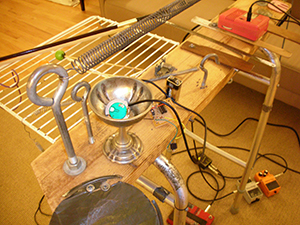 Für das Ö1 Kunstradio hat der in Chicago lebenden Musiker und Komponisten Eric Leonardson seine neue Radioarbeit "Coincidence and Control" entwickelt. Im Wiener Funkhaus verbrachte er zwei Tage im Studio und nahm mehrere Sets auf seinem 1984 selbstgebauten Instrument, das er Springboard nennt auf. Das Springboard ist mit Spulen und allen möglichen recycelten Materialien wie zum Küchenutensilien bestückt. Die damit erzeugten teils Klangfarben, Frequenzen und Tonhöhen nimmt der Künstler mit einem Piezo-Kontaktmikrofon ab. Das Springboard erzeugt unterschiedlichste und ungewöhnliche Sounds trotz oder gerade wegen seiner bescheidenen Ursprungsmaterialien.