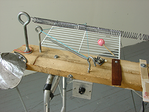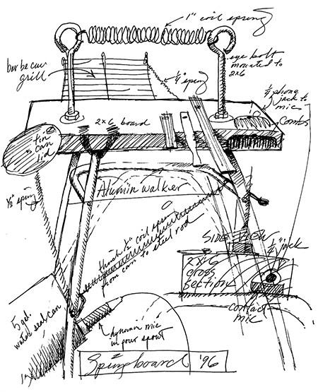 Mehrere Schraubenfedern sind auf dem Springboard montiert, sie verstärken die vorhandenen Vibrationen und erzeugen eine Art Nachhall. Auf Grund seiner disharmonischen Frequenzen reagiert es manchmal unberechenbar und Eigenschwingungen überlagern sich und erzeugen so erzeugen eine ungewöhnliche Eigendynamik. Diese ist mir genauso vertraut wie das zufällige Verhalten während jeder Performance, es ist jedes Mal ein heuristischer, greifbarer und fühlbarer Prozess. Diese Grundvoraussetzungen müssen akzeptiert werden, denn diese unbekannten Sounds belegen einen ästhetischen Raum zwischen den Genrekategorien, genauso nebulös und verschleiert wie der Klang von mit dem Bogen gespielten Schraubenfedern. Oberhalb und unterhalb seiner spektralen Limitierungen, im Hintergrund, an den Grenzen der Hörbarkeit, sind phantomhafte Melodien und Harmonien vorhanden.