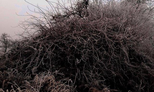 Und ich sage euch, so die Krähe, in dem Niemandsland hinter jener nachtblaugrünen Tür in den Wäldern, die so schwer zu finden ist und noch schwerer zu vergessen, auf einer glasgrünen Lichtung, im Vogelflug, im Parlieren der Erntemaschinen, ganz am Rand der Maisfelder, mit Eiszapfen gekrönt, zehn Grad unter Null, aus Rotz gezimmert, aus Wangenrot, steht es da: