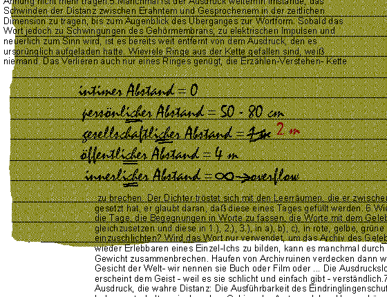 sich mit den Leerräumen, die er zwischen die Zeilen gesetzt hat, er