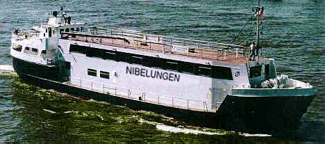 Nibelungen PC 8066 former Ocean tug 1977 Zapf Shipyard Linz, Austria 67,42 m 14,2 m 5,5 m 14,5 knots (2 engines, 14000 l/day) 10 knots (1 engine, 8000 l/day) 32 1990 Linz, Austria 2167 650 2 diesel, 1 Bow thruster Stork-Werkspoor 2x6 cylinders 2x4150 SHP 2x3094,7 KW 30 days yes 1 large rigid hull inflatable 1 working boat (sloop) 1 inflatable 13 |