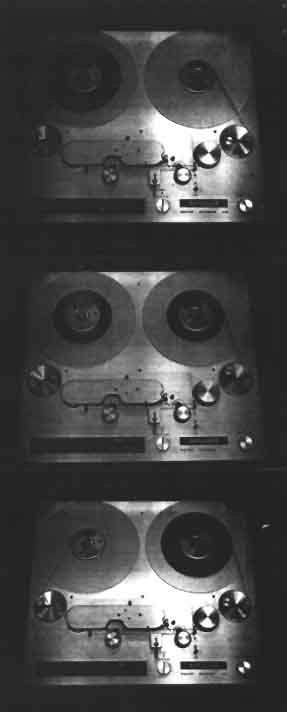Die osterreichische Bundeshymne wurde auf ein Tonband aufgenommen und ihr Text auf die Kreisfläche des aufgespulten Bandes mittels Siebdruckverfahrens gedruckt. An den bedruckten Stellen löschte sich die akustische Aufnahme. Beim Abspielen des Bandes wurde der aufgedruckte Text unsichtbar. Die Arbeit wurde durch 3 Fotografien in der Ausstellung dokumentiert. |