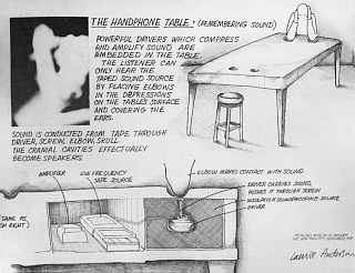 "Starke Endstufen, die den Ton komprimieren und verstärken, sind im Tisch eingebettet. Man kann den auf Tonband aufgezeichneten Ton nur hören, wenn man die Ellbogen in die Vertiefungen auf der Oberfläche des Tisches setzt und die Ohren mit den Händen bedeckt. Der Klang wird durch die Endstufen vom Band über die Schraube über den Schädel geleitet. Die Vertiefungen auf der Oberfläche werden somit zu Lautsprechern.." This Installation was part of Audioscene 79 |