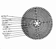 Tape produced by Z.B:S:, Fort Edward, New York. Sound engineer: Bob Bilecki "The labyrinth at Chartres Cathedral is made of blue and white stones set into the stone floor of the cathedral. It is a unicursal path winding in 34 turns through 11 concentric rings to the center. It is 12m 87 in diameter and has 552 steps following its course from the entrance to the center. This labyrinth formed the blueprint for all my work from 1972 to 1978. I attempted to make sound from it a few times. Two examples are 'The Labyrinth Scored for the Purrs of 11 Cats' and '552 Steps Through 11 Pairs of Strings'. For the former, I recorded 8 continuous minutes of purring from 11 different cats. They were then mixed to follow the exact path of the labyrinth with one cat representing each of the 11 concentric rings, 10 seonds of overlapping purrs to indicate each of the 34 turns. The tape follows in stereo the path of the labyrinth with the center finally represented by the simultaneous purring of all 11 cats. (The other work '552 Steps Through 11 Pairs of Strings' was a performance in my loft in San Francisco in which I stretched 11 pairs of piano wires of 11 different thicknesses across the wooden floor of my studio)." Terry Fox in: Linkage. LP und Katalog, Kunstmuseum Luzern, 1982 This piece was published on Airwaves. |