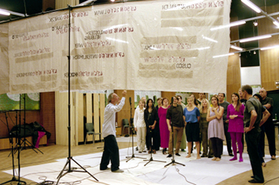 Jurist, Dolmetscherin, Kuratorin, Ingenieur.![]() Im April 2014 wurde der Sprechchor gegründet und im Mai die Probenarbeit wurde aufgenommen. Eingeübt wurden Textpartituren, die Pisek für diesen Zweck verfasst hat und die auf großen Tafeln statt auf individuell zu haltenden Zetteln angebracht waren, freilich mit einigem Freiraum für Entwicklungen innerhalb der Gruppe. So wurden einige Texte in geteilten Chören aufgeführt, als Kanon, als Wechselrede oder als Überlagerung. ![]() Bruno Pisek: "Vakuum. Das Ziel ist klar: Wir formulieren Gedanken, die uns wichtig sind und die in dieser Form sonst nirgends formuliert werden können. Was uns charakterisiert ist klar: Mehrsprachigkeit, sprechkompositorische Vielstimmigkeit, ungewöhnliche Partiturformate, bewegliche Chorfigur / beweglicher Chorkörper." Video 1 Video 2 ![]() Fragestellungen: