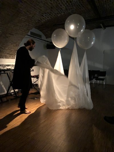 | Timothy Didymus and Joshua Legallienne will perform each about 25 Minutes live and for the first time they will also perform together in the third set Ö1 Kunstradio. Kosmische Glass by Timothy Didymus is a midi programmable glass automata. It can play as an installation via generative software, or be used as an performance instrument. There's also an album out with a foreword by Max Eastley. “Kosmische Glass is both a musical instrument and an installation, a development from playing liquid filled glasses with fingers. The evolution of ‘musical glasses’ in various histories of musical instruments dates back to the mid 17th century. Didymuses Kosmische Glass can be seen as a technical development.” Max Eastley 2015 ![]() Single material performances (2016–) by Joshua Legallienne 3.65m2/various dimensions ![]() Joshua Legallienne developed these performances as a way of creating complex acoustic sounds with only a single material, a fine plastic sheet. The sheet is manipulated to create a range of sounds and rhythms. Environmental conditions play a large role, which can dramatically alter the range of sounds that are possible in any performance. Although he regularly performs with a sheet 3.65m2, he has experimented with the form of the sheets, using sheets up to 12 meters in length in certain conditions. As part of my ongoing research into sustainable materials, he has started to create his own bioplastics. He hopes to be using handmade sheets from organic matter as a replacement for the pre-fabricated biodegradable sheets he has used in his performances to date. Joshua Legallienne developed these performances as a way of creating complex acoustic sounds with only a single material, a fine plastic sheet. The sheet is manipulated to create a range of sounds and rhythms. Environmental conditions play a large role, which can dramatically alter the range of sounds that are possible in any performance. In collaboration with stromschiene / Alten Schmiede Vienna. Links: Alte Schmiede Alte Schmiede Facebook |